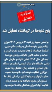 بر اساس مصوبه روز شنبه ۳۰ فروردین ۱۴۰۴ شورای برنامه ریزی و توسعه استان به ریاست دکتر حبیبی، استاندار کرمانشاه، با هدف مدیریت مصرف انرژی و حمایت و تحکیم کانون خانواده، روزهای پنج شنبه نیمه اول سال ۱۴۰۴، تمامی ادارات و سازمانهای دولتی، دانشگاهها و مراکز آموزشی استان (جز دستگاههای امدادی و خدمات رسان) تعطیل و به صورت دورکاری فعالیت خواهند کرد. با توجه به اهمیت حمایت از تولید و سرمایهگذاری در استان، بانکها مشمول این مصوبه نخواهند بود و تصمیم درباره فعالیت آنها با شورای هماهنگی بانکها خواهند بود.