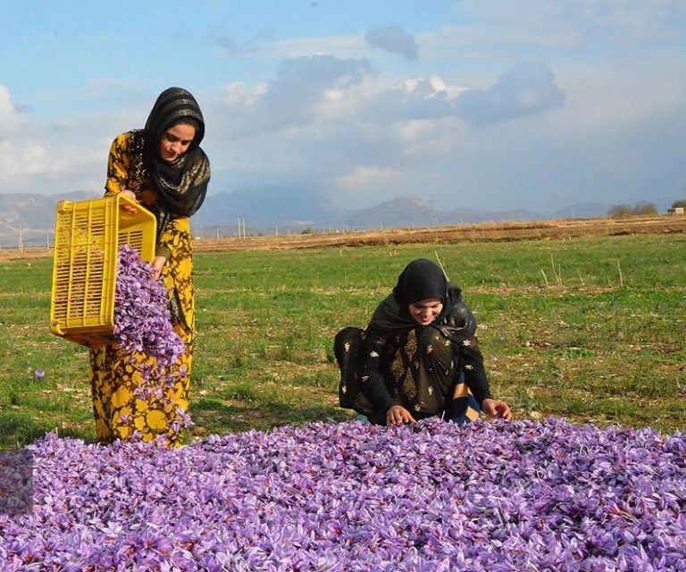 هوا گاه افتابی میشود وگاه ابری سیاه آسمان را می پوشاند و ان چنان میبارد که با خود میگویم مگرمی شود در این هوای سرد بارانی محصول برداشت کرد، ولی وقتی به مزارع نزدیکتر میشوم زیر باران زنان زیادی میبینم که مشغول کارند باید مسافتی پیاده رفت تا به انها رسید هر چند زمین اینجا بیشتر ریگ زاراست و همین باعث میشود کمتر درگیرراه رفتن در زمین گل الود باشم، اما باز هم کفش هایم از گل و لای در امان نیست.گلهای زعفران که هنوز برداشت نشده هنگام باران بسته میشود خانم چنور محمدی که صاحب مزرعه است از دور به استقبالم میاید میگوید:اگر افتاب کمی بر زمین به تابد گلها باز هم شکفته میشود بعد از حدود نیم ساعت با تابش افتاب پاییزی گلهای یاسی رنگ زعفران باز میشود و شبنم روی گلها زیبایی خاصی به انها میدهد. خانمی که مشغول برداشت است و لباس محلی برتن دارد درحالی که با هر کلمه لبخند میزند میگوید: من و همسرم درمزرعهی خانم محمدی چند روز است زعفران برداشت میکنیم تا قبل از این در خانه بیکار بودم، ولی خدا را شکر چند روزی ...